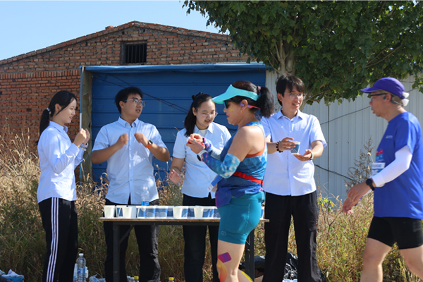 賽道上,秩序維護(hù)組的志愿者們化身“最熱情的指引者”。看到選手因路線不熟悉放慢腳步,立刻快步上前微笑指引,同時(shí)大聲喊出“加油!前方500米補(bǔ)給站”;遇到年長(zhǎng)選手體力不支,主動(dòng)遞上溫水,輕聲叮囑“調(diào)整呼吸,堅(jiān)持就是勝利”。補(bǔ)給站內(nèi),志愿者們更是以“秒級(jí)響應(yīng)”服務(wù)每一位選手。左手遞水杯、右手遞紙巾,動(dòng)作連貫嫻熟,還不忘根據(jù)選手狀態(tài)送上鼓勵(lì):“您跑得真棒,加油!”一句句溫暖的話語、一個(gè)個(gè)有力的手勢(shì),讓選手們瞬間充滿力量?!奥牭街驹刚吆啊佑汀哪且豢?,感覺腿上又有了勁,他們比我還在意我的成績(jī),特別感動(dòng)?!币幻状螀⒓玉R拉松的年輕選手笑著說。