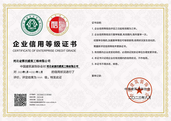 此次獲得中裝協(xié)AAA級企業(yè)信用等級證書,是中裝協(xié)對公司堅持守法經(jīng)營、誠信經(jīng)營的充分肯定和高度認(rèn)可,是對河北四建實力和品牌形象的最好詮釋。(質(zhì)量技術(shù)部)