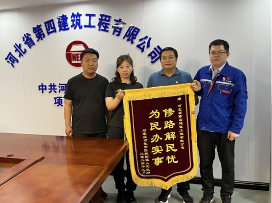 “感謝河北四建對鎮(zhèn)政府工作的大力支持,解決了桃園鎮(zhèn)學(xué)府聯(lián)合社區(qū)前進(jìn)村與滹沱河河堤路之間的道路損壞嚴(yán)重的大問題……”6月5日下午,石家莊市長安區(qū)桃園鎮(zhèn)人民政府代表琚紅珊帶著濃濃的謝意專程來到九分公司中共河北省委黨校項(xiàng)目部,將“為民辦實(shí)事 修路解民憂”的錦旗交到分公司黨總支書記、經(jīng)理劉喜良手里,對河北四建公司的大力支持和幫助表示誠摯感謝。