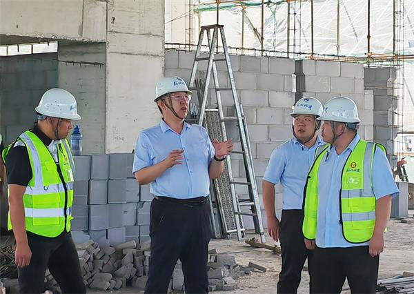 隨后,唐志強深入施工現(xiàn)場實地檢查??吹紹館和C館鋼結(jié)構(gòu)正在施工,他叮囑項目部切實做好暑期安全保障工作。在正進(jìn)行二次結(jié)構(gòu)施工的A館,他仔細(xì)查看了主體結(jié)構(gòu)梁板柱和二次結(jié)構(gòu)砌筑情況,對施工質(zhì)量表示滿意;詳細(xì)詢問了施工人員數(shù)量,提醒項目部加強現(xiàn)場施工組織,確保進(jìn)度;針對模板異形較多、周轉(zhuǎn)次數(shù)少、占用量大的問題,建議項目部多個單位工程統(tǒng)籌策劃,合理推進(jìn),科學(xué)組織施工,保證進(jìn)度的同時降低成本。