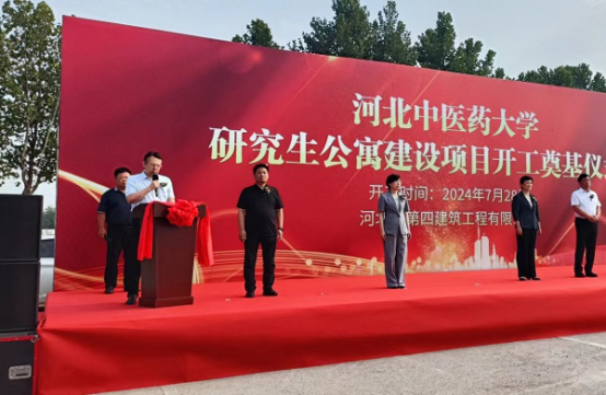 奠基儀式現(xiàn)場,挖掘機、裝載機身披大紅花整齊排列,猶如即將出征的戰(zhàn)士,工人整裝待發(fā),信心滿滿、斗志昂揚。儀式在歡快激昂的樂曲聲中拉開序幕。主持人首先介紹了參加本次儀式的相關領導和項目概況。隨后,唐志強作為施工單位代表首先發(fā)言,“我公司有幸承接該施工任務,充分體現(xiàn)了項目主管部門和建設單位對我們國有建筑企業(yè)的信任和支持。河北四建一定高標準、嚴要求,為項目順利實施提供有力保證,為業(yè)主提供滿意服務,為河北中醫(yī)藥大學醫(yī)學教育的高質量發(fā)展貢獻力量!”最后,學校黨委副書記孫士江表示,河北中醫(yī)藥大學研究生公寓為省政府支持骨干大學建設項目,希望參建各方全力以赴確保按時完工投入使用,建設“品質工程”“一流工程”,促進學校各項事業(yè)取得新成就,為經(jīng)濟強省、美麗河北建設作出新的更大貢獻!