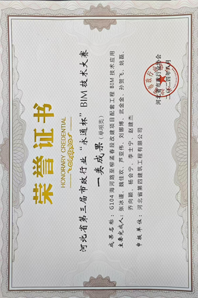 8月16日,七分公司收到了河北省市政行業(yè)協(xié)會(huì)頒發(fā)的榮譽(yù)證書。分公司參賽的“G104海河路至柳孟春段改建項(xiàng)目配套工程BIM技術(shù)應(yīng)用”成果,在河北省第三屆市政行業(yè)“永通杯”BIM應(yīng)用技能大賽中被評(píng)為一類成果。